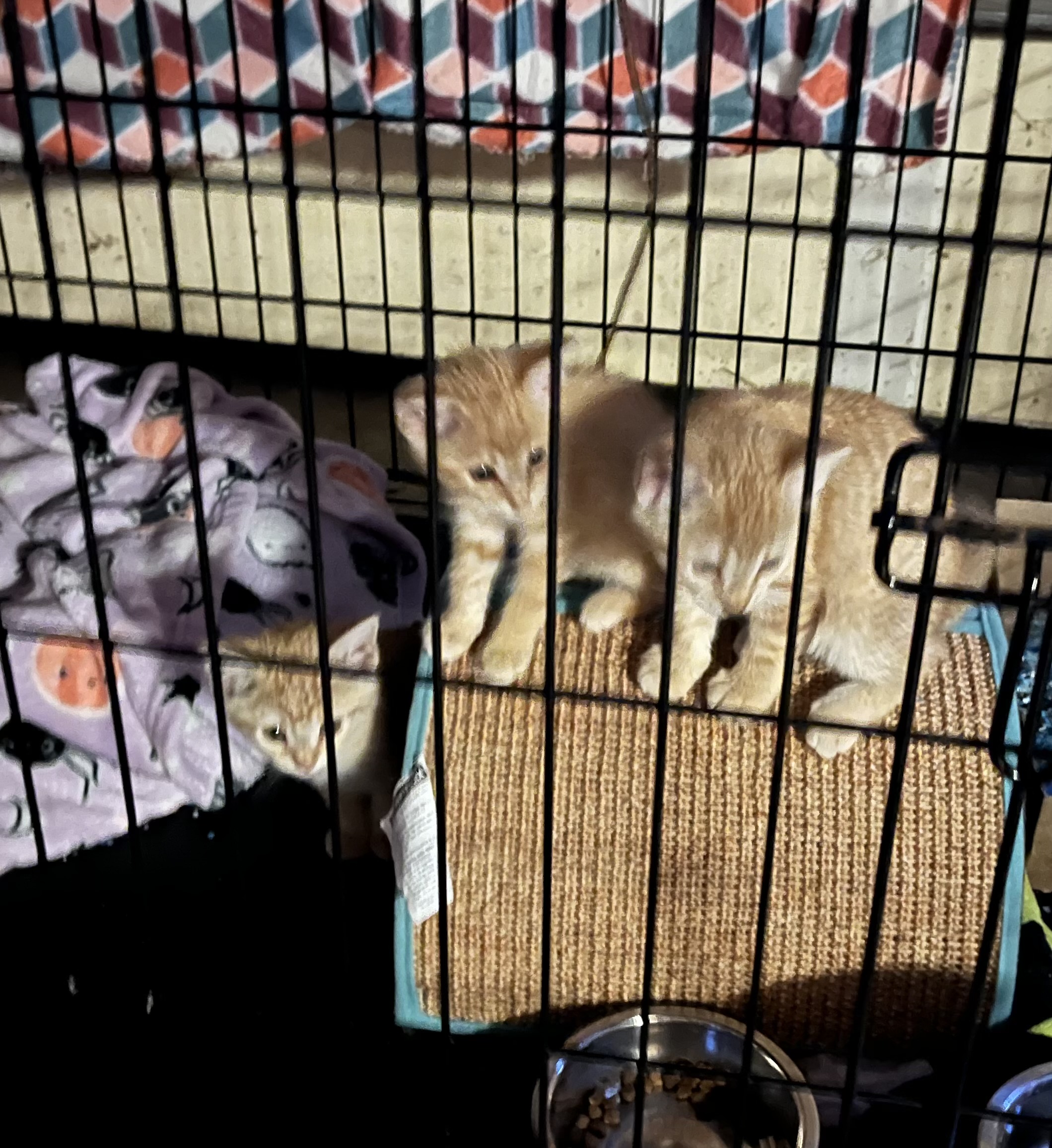 I first met the Kittens in 2022. One day Abbi and I were laying down when Abbi's mom called for us and said a neighbor had a kitten under her car. After walking over we learned it was up in the car trying its best to hide from us. After 20 minutes of trying we got the kitten out of the car but it bit my thumb causing me to let it go. After a day we were finally able to grab the little guy after he wandered onto our property and put him in the garage. After being named "Arthur" he enjoyed a cozy cage with all needs met. He eventually warmed up to us and was such a sweet little guy. However he wasnt alone, I walked outside and looked over at the neighbors house and saw a little orange ball walking and knew it was another kitten. After trying to hide from me I was able to get her into a cage and joined her with her brother. We named her Astrid. After some more time yet another kitten was caught while Abbi and I were away and We named him "Jubilee". Once all of them were the right weight we got them fixed and put them up for adoption in the shelter. All three were adopted and all have found amazing owners.